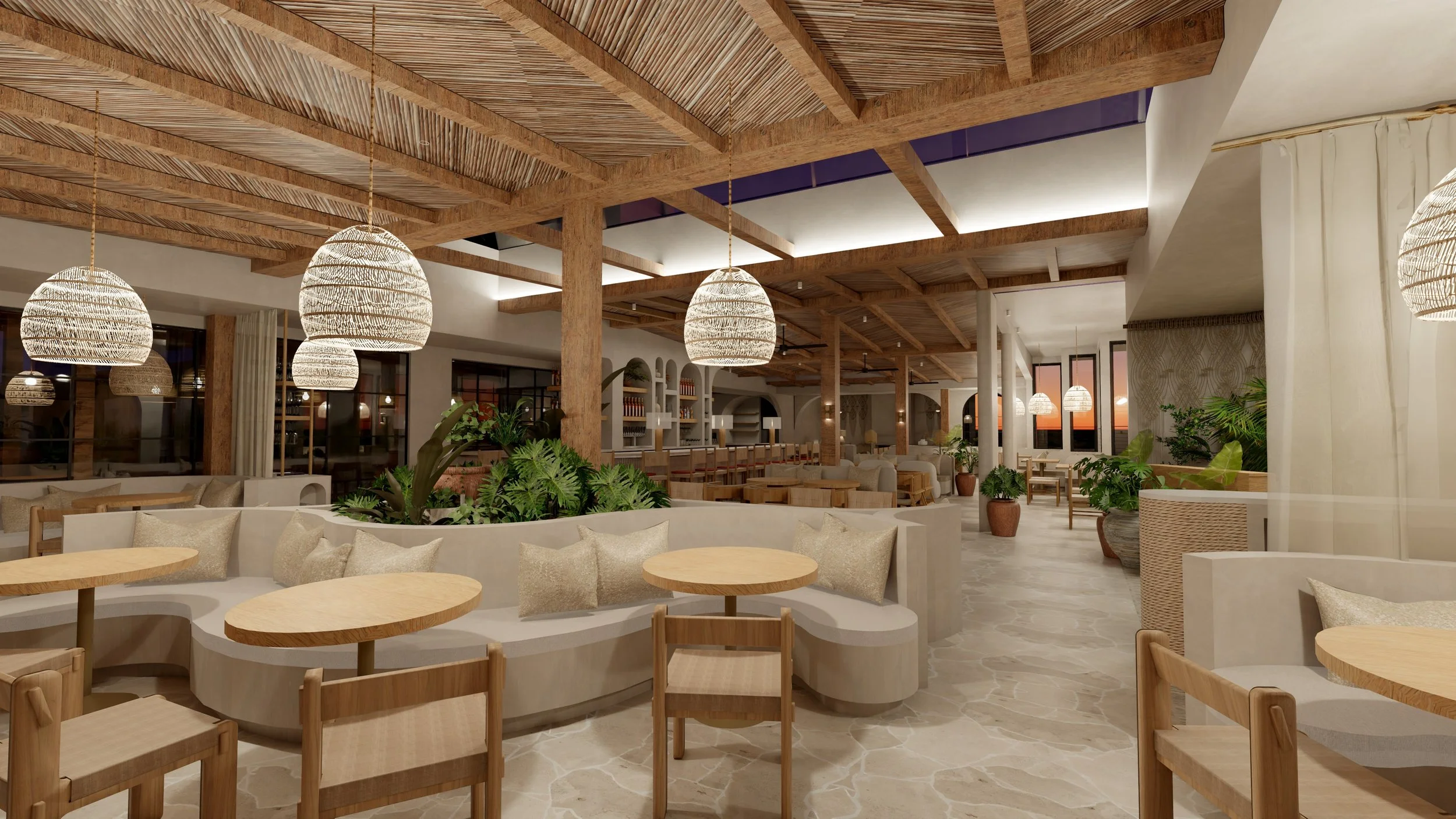 At Tecture Design Studio, we push to prioritize authentic, natural materials that celebrate texture and craftsmanship. Woven pendant lighting, thatch ceilings, and hand-troweled plaster walls infuse warmth and depth into the interior. Integrated greenery adds vibrancy and movement, enhancing the connection between the restaurant and its coastal surroundings. This palette of natural tones and textures creates a timeless design language, grounding the project in a coastal Mediterranean identity that feels both sophisticated and approachable.